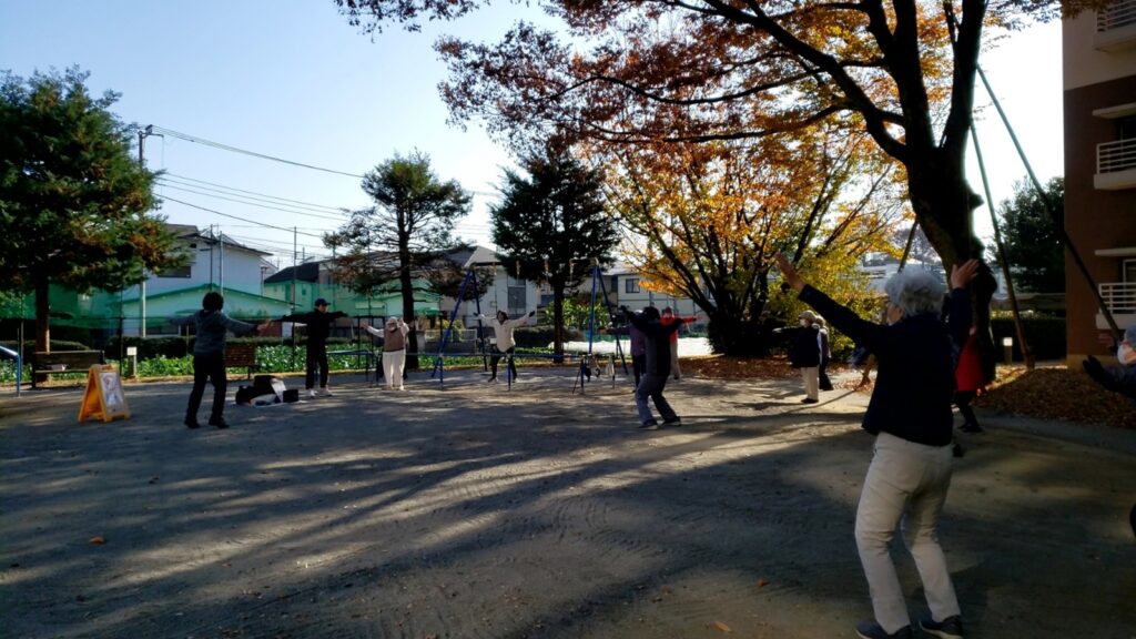 緑町グリーンタウンの敷地奥の公園で、毎週月曜日と木曜日の10時からラジオ体操第一、第二、みんなの体操をしています。9時半頃から集まって、おしゃべりに花が咲きます。この日は気温14℃、木々はすっかり紅葉しておりました。公園の向こうには畑が見え、立派な小松菜が植わっていました。90代の方もいらっしゃって「励みになるわ」との声もありました。
