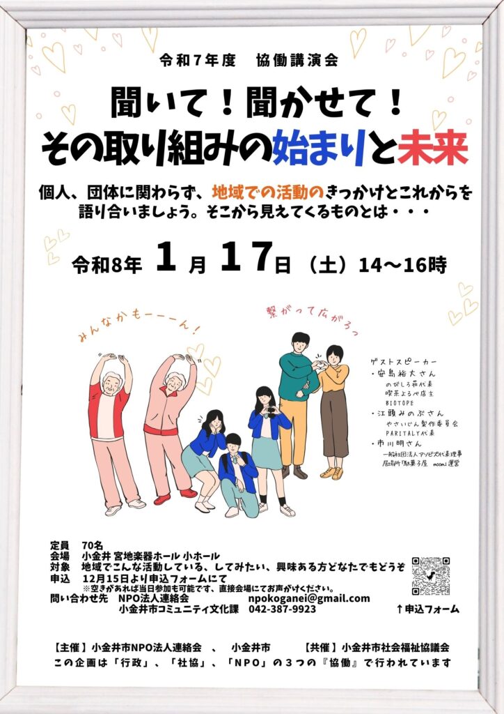 本講演会では、小金井市の地域でさまざまな活動に取り組んできたゲストスピーカーをお迎えし、活動を始めたきっかけや、これまでの歩み、そしてこれから描いている未来についてお話しいただきます。悩みや試行錯誤も含めた“リアルな声”に触れることで、地域活動の奥深さや可能性を感じていただける内容です。
