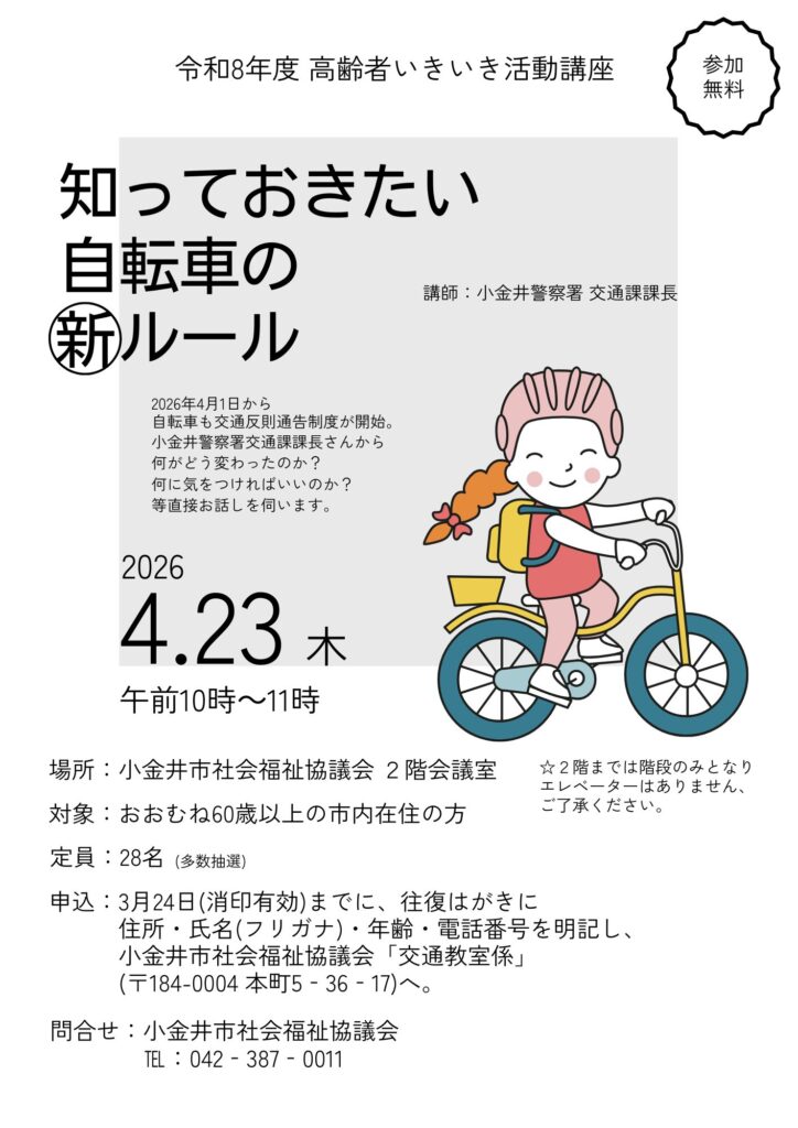令和8年3月24日(消印有効)までに、往復はがきに住所・氏名(ふりがな)・年齢・電話番号を明記し、小金井市社会福祉協議会「交通講座係」(〒184‐0004 本町5‐36‐17)へ。