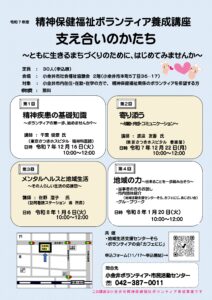 支え合いのかたち~ともに生きるまちづくりのために、はじめてみませんか~ 【第1回】精神疾患の基礎知識 ~ボランティアの第一歩、始めませんか?~令和7年12月16日(火)10:00~12:00 【第2回】寄り添う ~傾聴・ […]